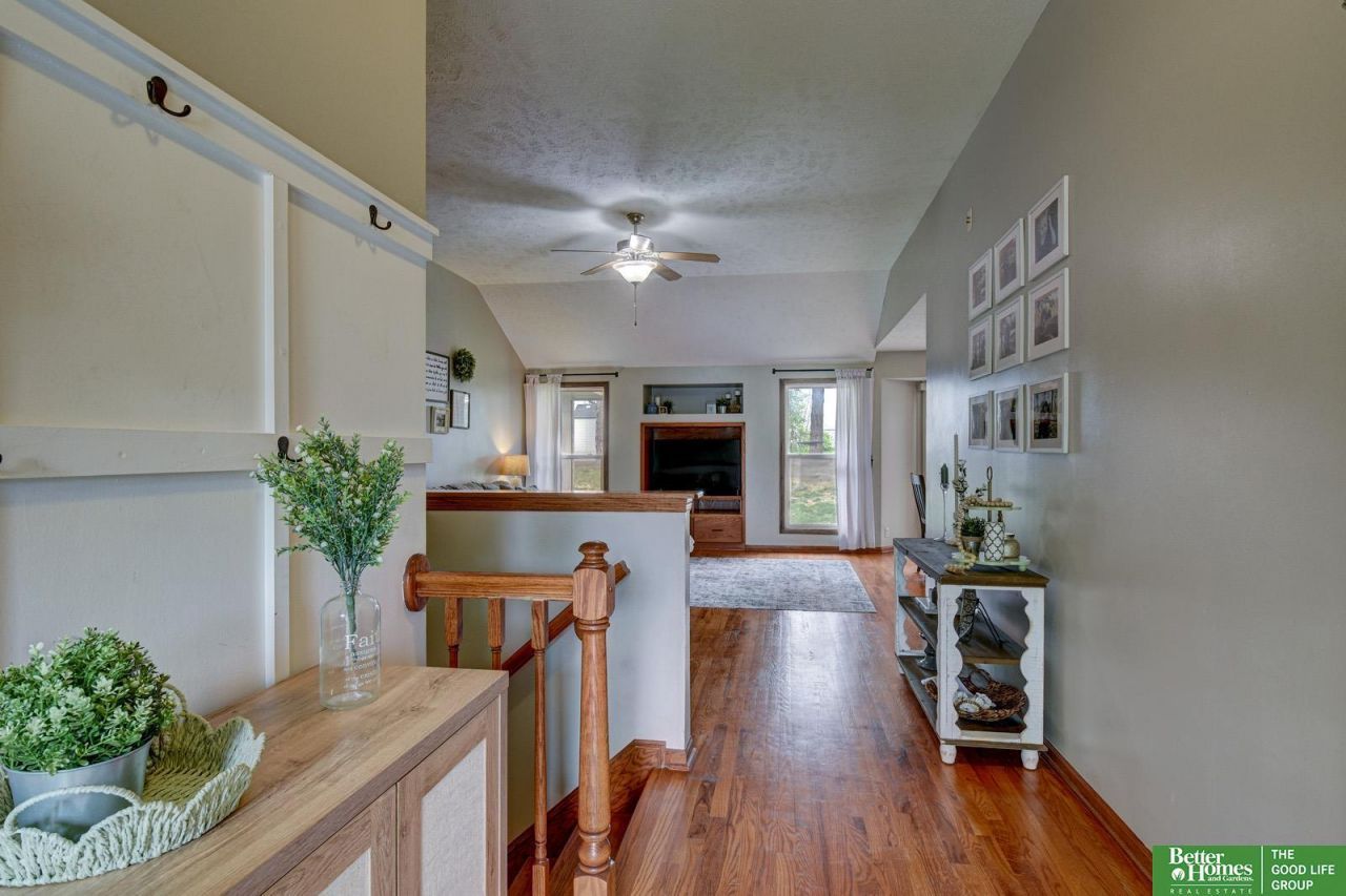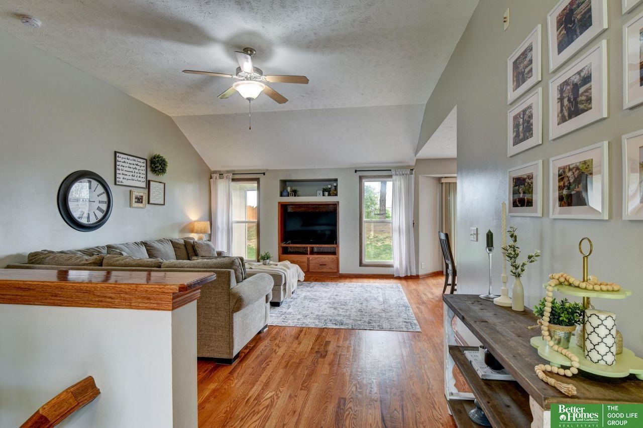 Tucked away on a quiet circle just 2 miles from Offutt Air Force Base, this pre-inspected 5-bedroom ranch offers exceptional space and flexibility in Bellevue Schools. The open main level welcomes you with vaulted ceilings, hardwood floors, and a spacious great room designed for easy everyday living and entertaining. The kitchen is well-equipped with solid wood cabinetry, a large walk-in pantry, and all appliances included. Convenient access to main floor laundry. The primary suite features a walk-in closet and private 3/4 bath. Downstairs, the finished basement expands your living space with upgraded flooring, a wet bar, full bath, two oversized bedrooms, dedicated office, and a generous family room. Outside, enjoy added fencing, mature trees, a storage shed, and sprinkler system. Major updates include a 2017 roof, 2020 water heater, and smart thermostat. Move right in and enjoy.